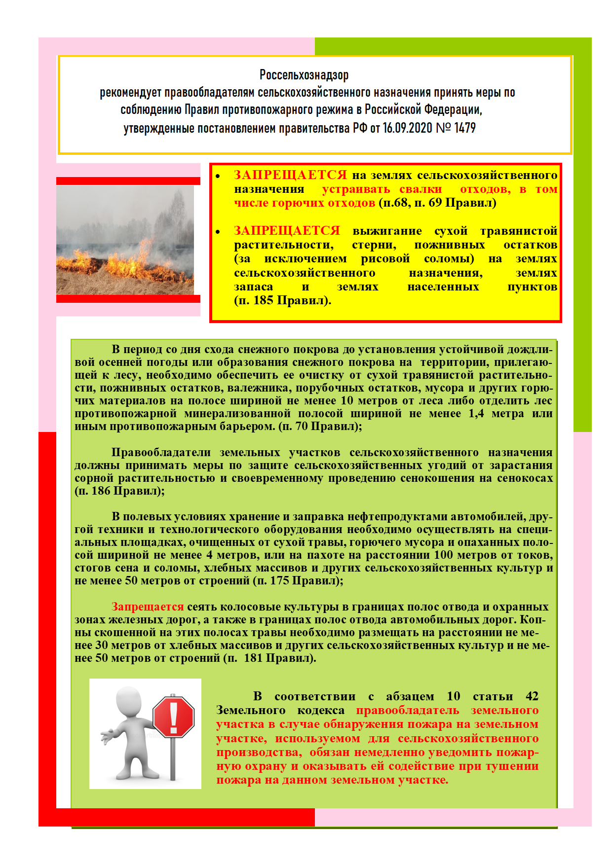 Россельхознадзор рекомендует правообладателям сельскохозяйственного назначения принять меры по соблюдению Правил противопожарного режима в Российской Федерации, утв. Постановлением правительства РФ от 16.09.2020 № 1479