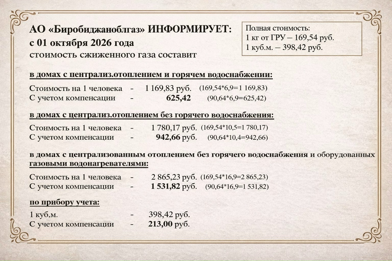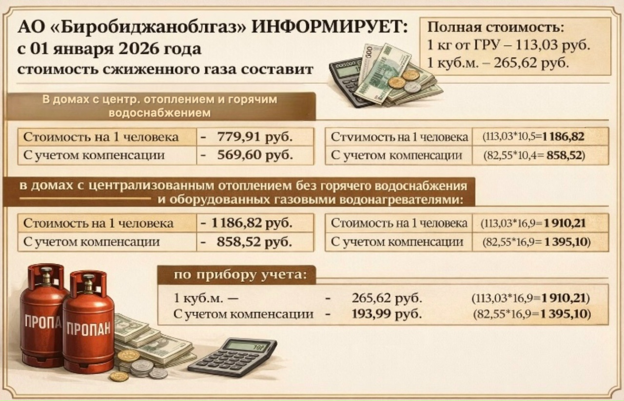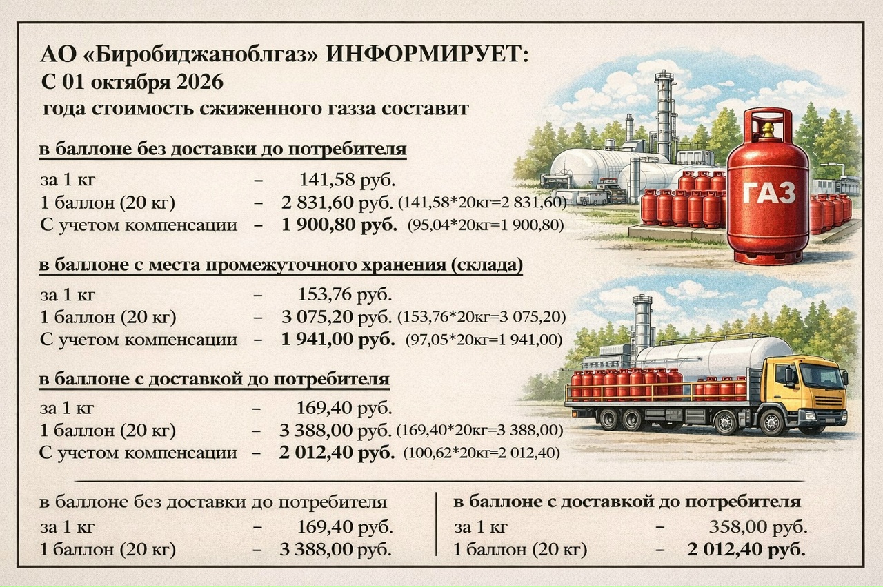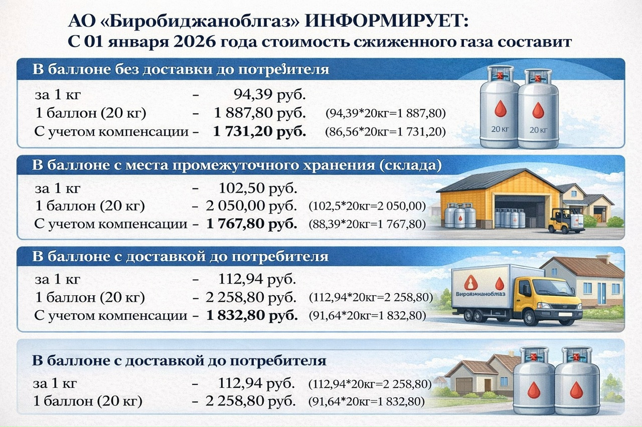 НОВОСТИ: ✅АО «Биробиджаноблгаз» информирует о применяемых розничных ценах на сжиженный газ с 1 января по 31 декабря 2026 года.