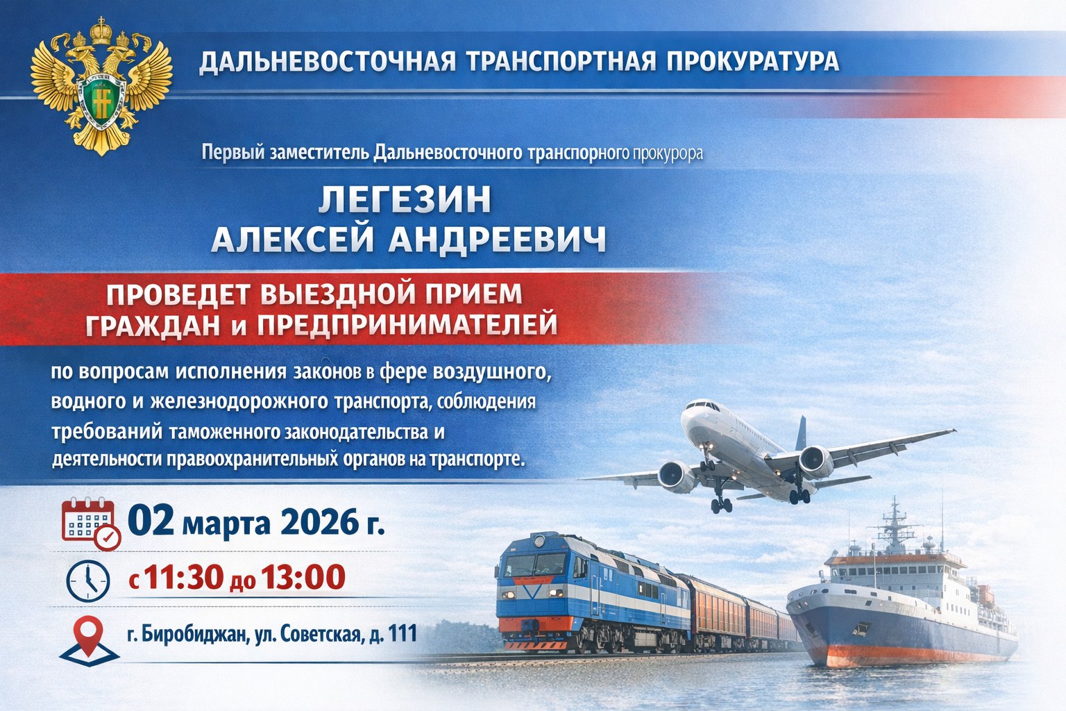 Первый заместитель Дальневосточного транспортного прокурора Легезин Алексей Андреевич проведет выездной прием граждан и предпринимателей по вопросам исполнения законов в сфере деятельности воздушного, водного и железнодорожного транспорта, соблюдения требований таможенного законодательства, а также осуществлении оперативно-розыскной и уголовно-процессуальной деятельности правоохранительными органами на транспорте.
