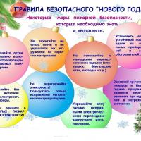 ПАМЯТКА «БЕЗОПАСНЫЙ НОВЫЙ ГОД» Приближается Новый год, Рождественские праздники. Их ждут взрослые и дети. Чтобы долгожданные праздники не закончились трагедией надо строго соблюдать правила пожарной безопасности. Ёлку нужно установить таким образом, чтобы она не мешала свободно ходить по комнате и не заслоняла двери, ведущие в другие комнаты. И, что самое главное, стояла бы подальше от батарей отопления. Нельзя украшать ёлку игрушками, которые легко воспламеняются, обкладывать подставку под ёлкой обычной ватой, украшать дерево горящими свечками. Эти правила относятся как к настоящим ёлкам, так и к искусственным. Электрические гирлянды тоже могут стать причиной пожара или поражения человека электрическим током – электротравмы. Гирлянда безопасна, если прошла сертификацию и во время хранения на складе магазина не была испорчена. Бывает, что гирлянда служит на протяжении многих лет. В этом случае тем более стоит удостовериться, что она исправна. Какой новогодний праздник обходится без бенгальских огней, фейерверков, петард! Перед Новым годом все прилавки завалены пиротехническими игрушками. К сожалению, нередко их качество оставляет желать лучшего. Поэтому необходимо помнить, что применение пиротехнических игрушек может привести не только к пожару, но и к серьёзным травмам. Чтобы предотвратить несчастный случай, необходимо строго соблюдать правила пользования пиротехническими изделиями. Не стоит приобретать их на оптовых рынках. Нельзя использовать игрушки с поврежденным корпусом или фитилем Детям без присмотра взрослых недопустимо: • использовать пиротехнические игрушки в жилых помещениях – квартирах или на балконах • носить такие изделия в карманах • направлять ракеты и петарды на людей • подходить ближе, чем на 15 метров к зажжённым фейерверкам • бросать петарды под ноги • поджигать фитиль, держа его возле лица • использовать пиротехнику при сильном ветре. Уважаемые родители! Расскажите ребёнку о правилах пожарной безопасности, выполняя это в доступной форме в виде бесед, сказок дети узнают об опасностях игр со спичками, зажигалками, петардами, о правилах поведения при пожаре. Помните! Соблюдение мер пожарной безопасности – это залог вашего благополучия, сохранности вашей жизни и жизни ваших близких!
