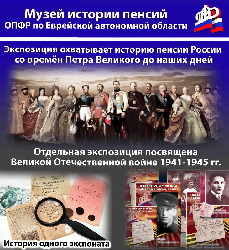 В связи со сложной эпидемиологической ситуацией посещение ОПФР по Еврейской автономной области, где располагается музей, ограничено, однако музей истории пенсий постоянно развивается и выполняет свою главную функцию – сохраняет историю пенсий нашей страны, а после снятия ограничений – продолжит рассказывать о ней своим посетителям.