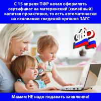 Проактивное оформление позволяет семьям быстрее получать сертификат на материнский (семейный) капитал и не тратить усилия на его оформление, ведь специально обращаться в Пенсионный фонд не потребуется. Все сведения о появлении ребенка, дающего право на материнский капитал, поступают в ПФР из государственного реестра записей актов гражданского состояния.
