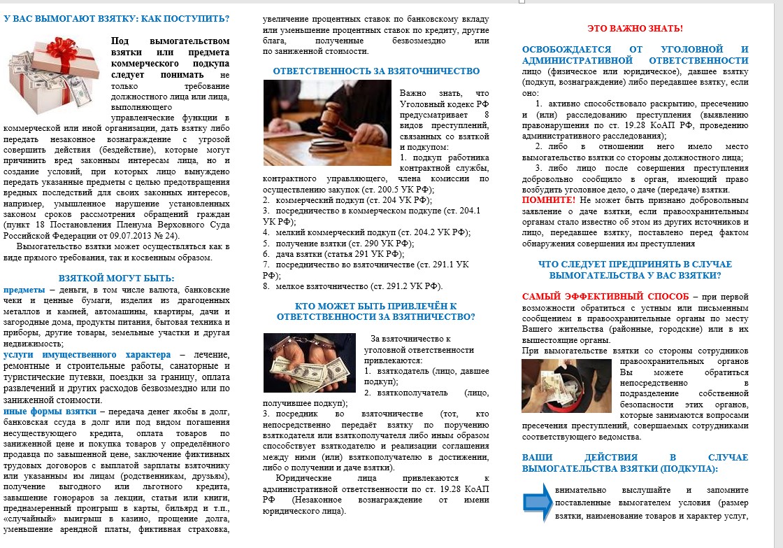 Биробиджанская межрайонная природоохранная прокуратура ПАМЯТКА Что нужно знать о КОРРУПЦИИ В соответствии с п. 1 ст. 1 Федерального закона от 25.122008 № 273-ФЗ «О противодействии коррупции» под коррупцией понимается злоупотребление служебным положением, дача взятки, получение взятки, злоупотребление полномочиями, коммерческий подкуп либо иное незаконное использование физическим лицом своего должностного положения вопреки законным интересам общества и государства в целях получения выгоды в виде денег, ценностей, иного имущества или услуг имущественного характера, иных имущественных прав для себя или для третьих лиц либо незаконное предоставление такой выгоды указанному лицу другими физическими лицами, а также совершение указанных деяний от имени или в интересах юридического лица. Уголовный кодекс Российской Федерации предусматривает уголовную ответственность как за получение взятки, так и за дачу взятки и посредничество во взяточничестве.