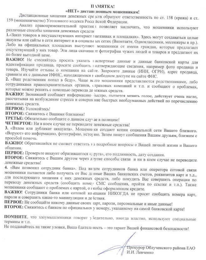 Руководствуясь положениями Приказа Генпрокуратуры РФ от 10.09.2008 № 182 «Об организации работы по взаимодействию с общественностью, разъяснению законодательства и правовому просвещению», в целях правовой пропаганды и ликвидации правовой неграмотности граждан, а также Приказа Генпрокуратуры РФ от 10.09.2008 № 182 «Об организации работы по взаимодействию с общественностью, разъяснению законодательства и правовому просвещению» предлагаю разместить на официальном сайте муниципального образования (опубликовать в газете), в рубрике прокурор разъясняет, следующую информацию. Прокуратура района разъясняет: Введена уголовная ответственность за фиктивную постановку на учет иностранных граждан по месту пребывания в нежилом помещении Федеральным законом от 12.11.2018 № 420-ФЗ внесены изменения в статью 322.3 Уголовного кодекса Российской Федерации. Введена уголовная ответственность также за фиктивную постановку на учет иностранных граждан по месту пребывания в нежилом помещении. Ранее уголовная ответственность была установлена за фиктивную постановку на учет иностранных граждан по месту пребывания в жилом помещении. Под фиктивной постановкой на учет иностранных граждан или лиц без гражданства по месту пребывания в Российской Федерации понимается постановка их на учет по месту пребывания в Российской Федерации на основании представления заведомо недостоверных (ложных) сведений или документов, либо постановка иностранных граждан или лиц без гражданства на учет по месту пребывания в Российской Федерации в помещении без их намерения фактически проживать (пребывать) в этом помещении или без намерения принимающей стороны предоставить им это помещение для фактического проживания (пребывания), либо постановка иностранных граждан или лиц без гражданства на учет по месту пребывания по адресу организации, в которой они в установленном порядке не осуществляют трудовую или иную не запрещенную законодательством Российской Федерации деятельность. Ответственность за данное преступление предусмотрена вплоть до лишения свободы сроком на 3 года. Внесенные изменения вступили в силу 23 ноября 2018 года. Прокурор Облученского района И.И. Левченко