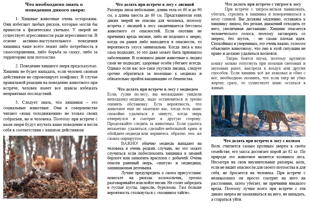 Памятка о поведении человека при встрече с медведем Следите за своим положением в пространстве - нельзя оказаться на единственном пути отступления медведя, и если медведю уйти некуда, ему ничего не останется, кроме как "спасаясь" напасть на вас. Если вы окажетесь между медведицей и медвежатами нападение неизбежно, встреча эта одна из самых опасных ситуаций. Не ловите рыбу на виду у медведя, зверь может начать защищать свою территорию, свое рыбное место. И тем более не следует пугать медведя, чтоб отогнать его от уже пойманной им рыбы. Медведь может уйти, но через некоторое время вернуться за вами. Готовьте пищу с максимальной осторожностью. Мифы о том, что запах костра и бензина отпугивают медведей остаются мифами. Медведь не только сильное, но и умное животное - за многие годы медведи усвоили, что где есть люди - там пища - и зачастую страх перед человеком у медведя пересиливается голодом. Не оставляйте объедки, не подкармливайте медведя, он не отстанет от вас и может пытаться силой отобрать вашу еду… Не устраивайте лагерь на медвежьей тропе, он может и рассердиться непрошенным гостям В основном, у медведей прекрасный нюх и зрение, но со слухом проблемы. Если вы идете с подветренной стороны - он не учует вас и не увидит вас, вы рискуете столкнуться с медведем нос к носу. Из-за неожиданности он может дать деру, а может и напасть. Поэтому, двигаясь по особо медвежьим местам, старайтесь производить больше шума, шумите, пойте, громко разговаривайте, хорошо помогает свисток или колокольчик. Но вот встреча с медведем состоялась. Первое, сохраняйте спокойствие. Ни в коем случае нельзя убегать. Если вы убегаете, значит, вас нужно догонять! А медведь догоняет даже лошадь - шансов убежать от него нет. В погоне за жертвой он может развить скорость до 60 км/ч. Медведь еще и отличный пловец. Миф о том, что от медведя можно удрать вплавь не соответствует действительности. Он легко может преодолеть по воде расстояние в 6-10 км и с удовольствием купается в жаркие летние дни.Посмотрите на медведя, дайте ему понять, что вы видите его, он видит вас. Медленно, не делая резких движений, снимите рюкзак и поставьте перед собой. Как правило медведь посмотрит на вас, может встанет на задние лапы и постарается скрыться, человека медведи стараются не трогать. Если медведь не движется по направлению к вам, попытайтесь очень осторожно удалиться. Если ваше движение провоцирует медведя на приближение к вам, замрите на месте, говоря этим на языке тела: «я не боюсь тебя, могу напасть в ответ». Что же делать, если медведь не уходит. Он может не собирается нападать, ему может быть просто любопытно, в прочем, как и вам. Медведи боятся того, кто больше их по размеру, главное - выше. Залезьте друг другу на плечи, поднимите над головами лыжные палки, весла, размахивайте всем этим, громко кричите, хлопайте в ладоши, стучите в котелки - часто это помогает. Но на это лучше не надеяться… Если ничего не помогает, медведь начинает рычать, рыть перед собой лапой землю, делать короткие выпады в вашу сторону - значит, он готовится к нападению. А если встал на задние лапы и пошёл на вас, значит пришла пора защищаться. Если у вас есть ружье, то надо стрелять… в воздух конечно. Нет ружья, можно брать с собой фальшвеер или петарды, они мало весят, а шуму и эффектов производят достаточно. Однако не все медведи 